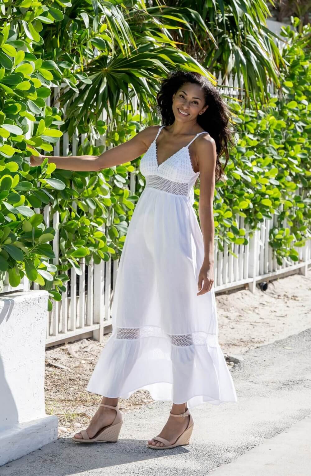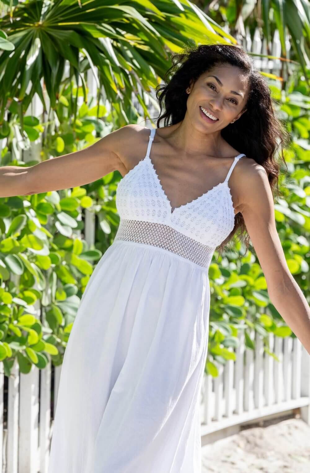 Cotton Natural women’s adjustable spaghetti strap Maxi Dress. This absolutely stunning dress has a crochet bust line and leg line, with an open back with a tie.