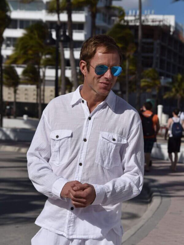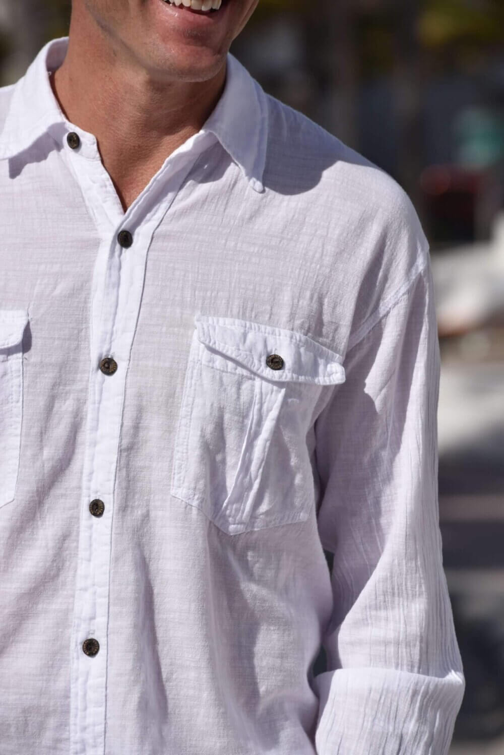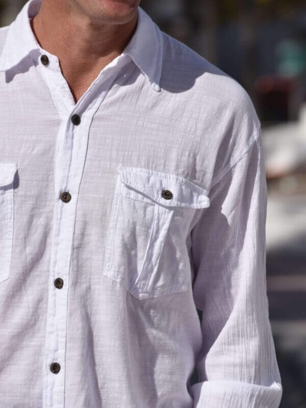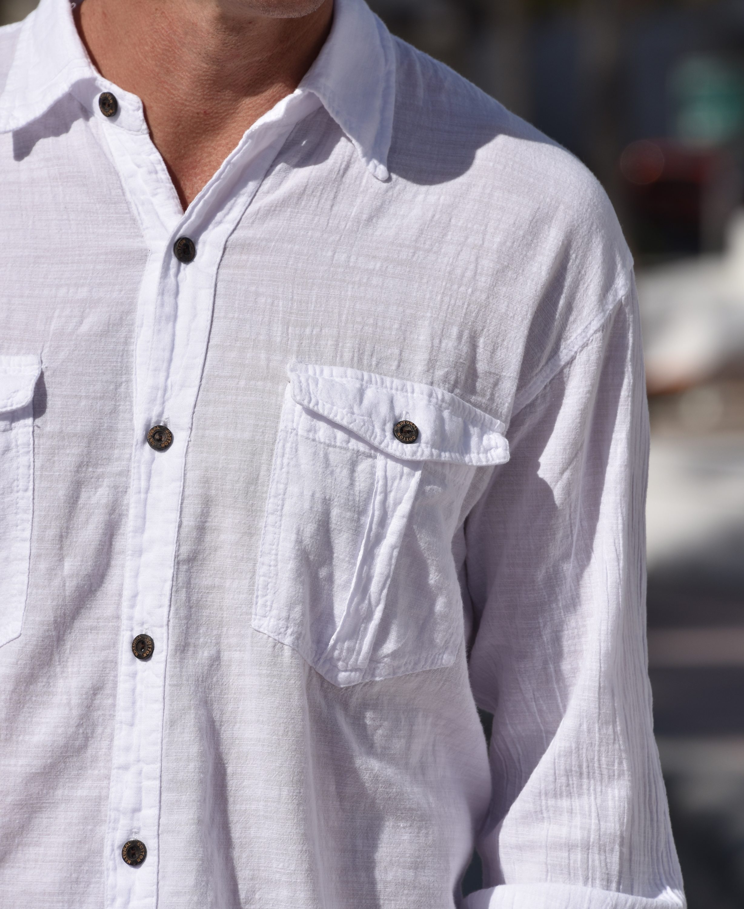 Cotton Natural long sleeve collared button down, featuring double breast pockets.