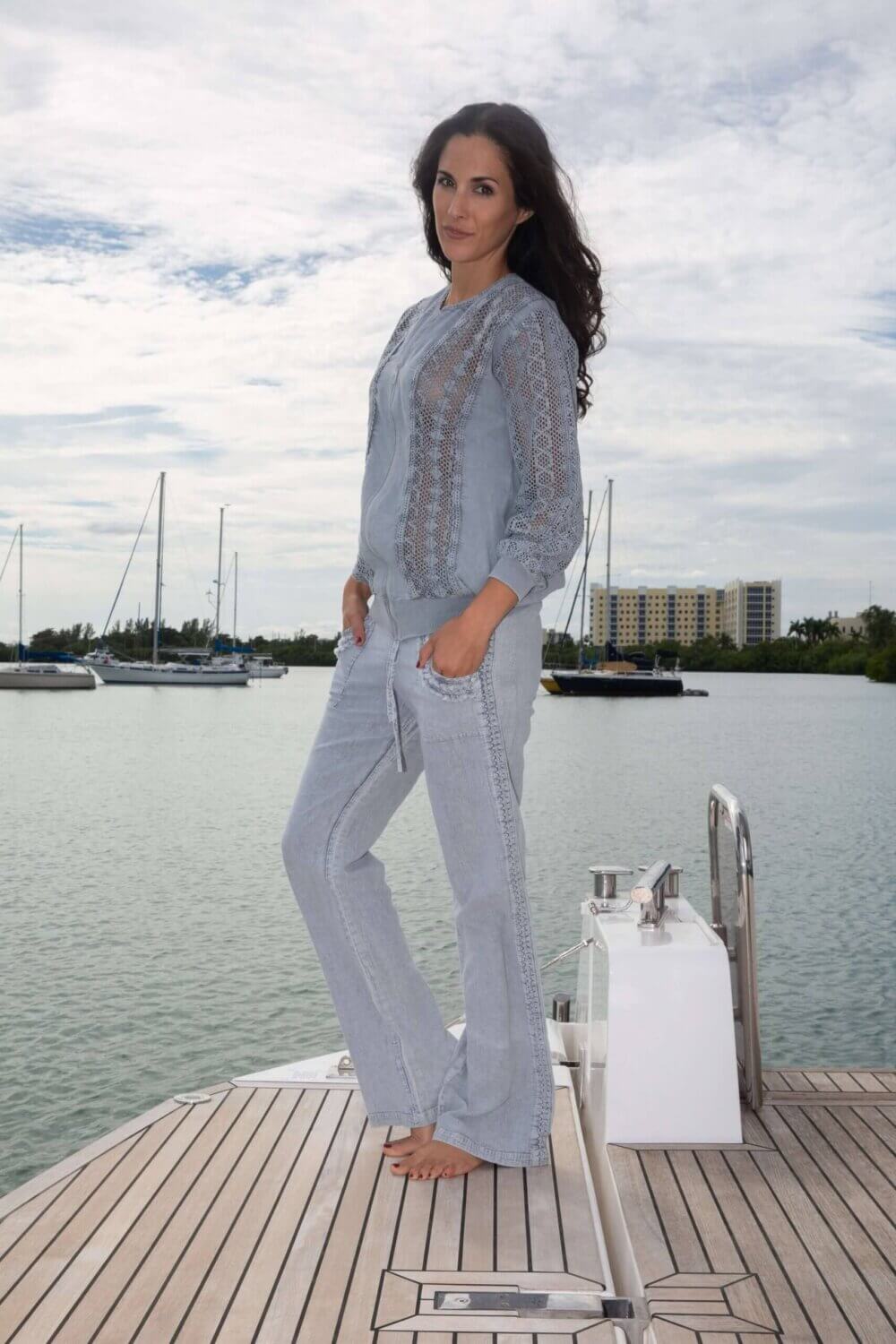 Cotton Natural women’s Long Pants with drawstring and fringe pockets in Fossil Gray. These comfortable pants feature a beautiful embroidery pattern on the sides of the legs.