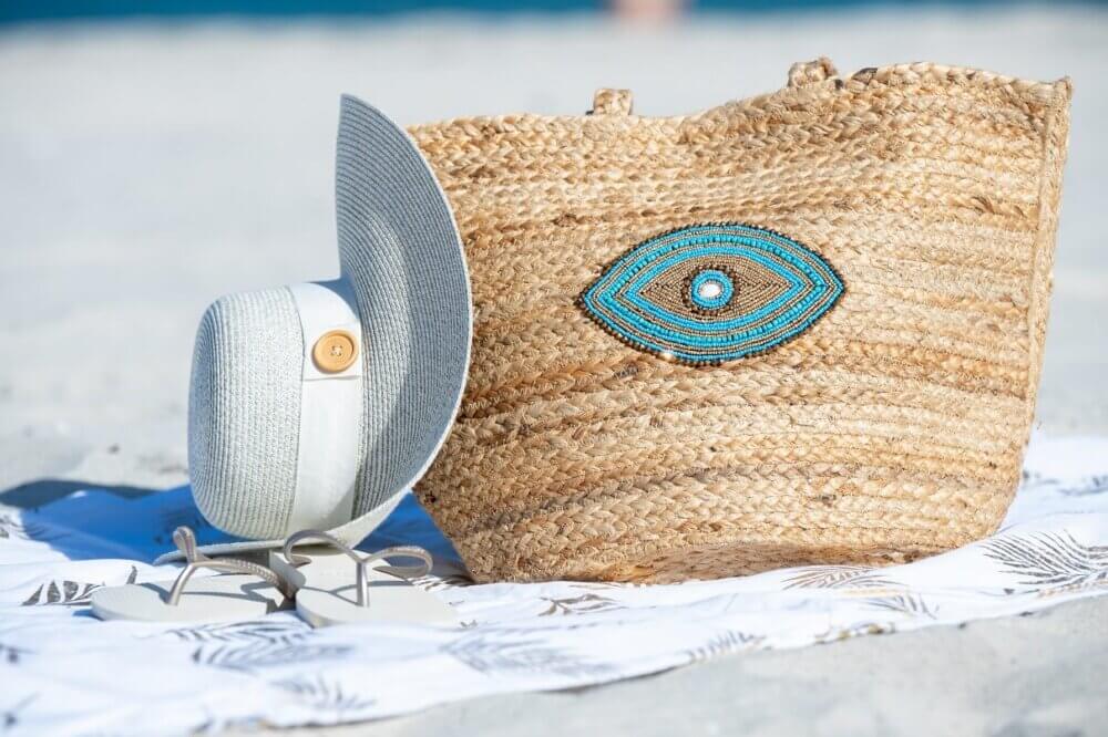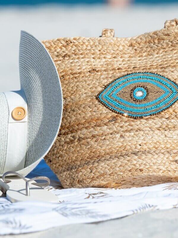 Large-sized bag made of jute material and hand-beaded “Lucky Eye”.