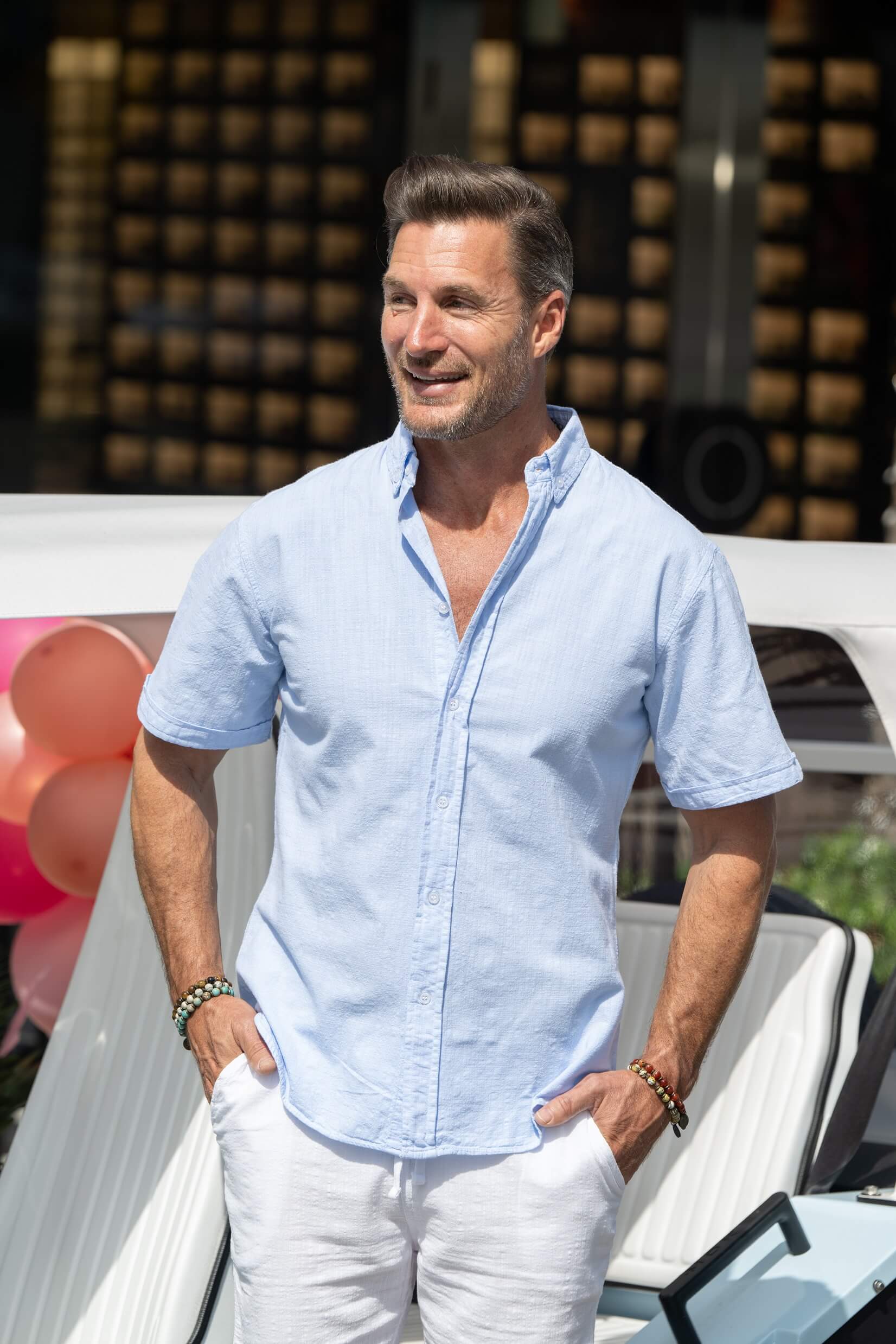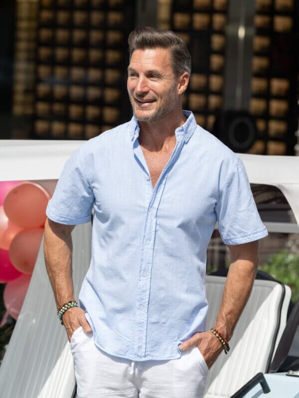 Cotton Natural Cotton and Linen blend Men’s shirt in blue. Button down, short sleeves.