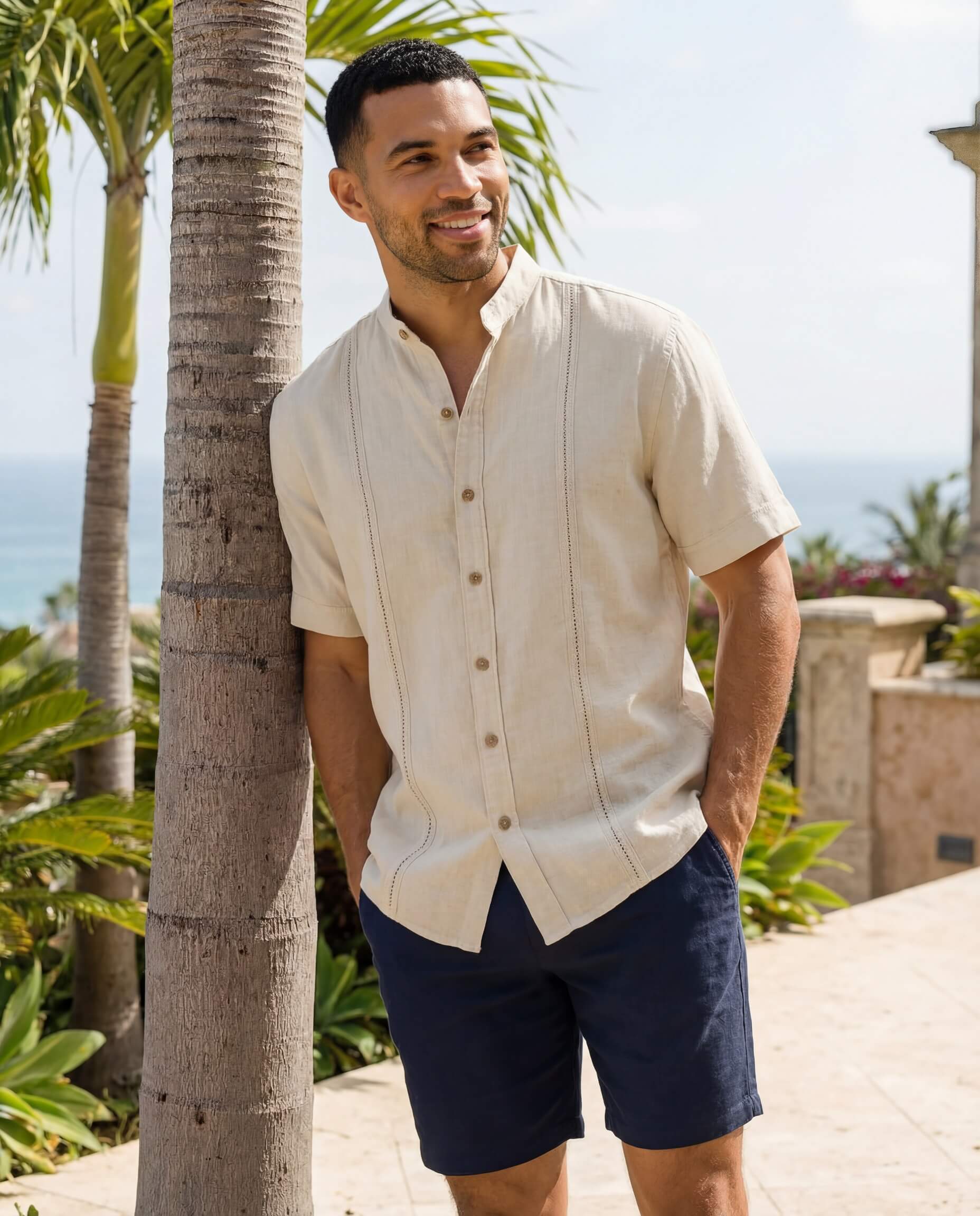 Cotton Natural Mandarin collar, short sleeve Guayabera button down shirt in beige.