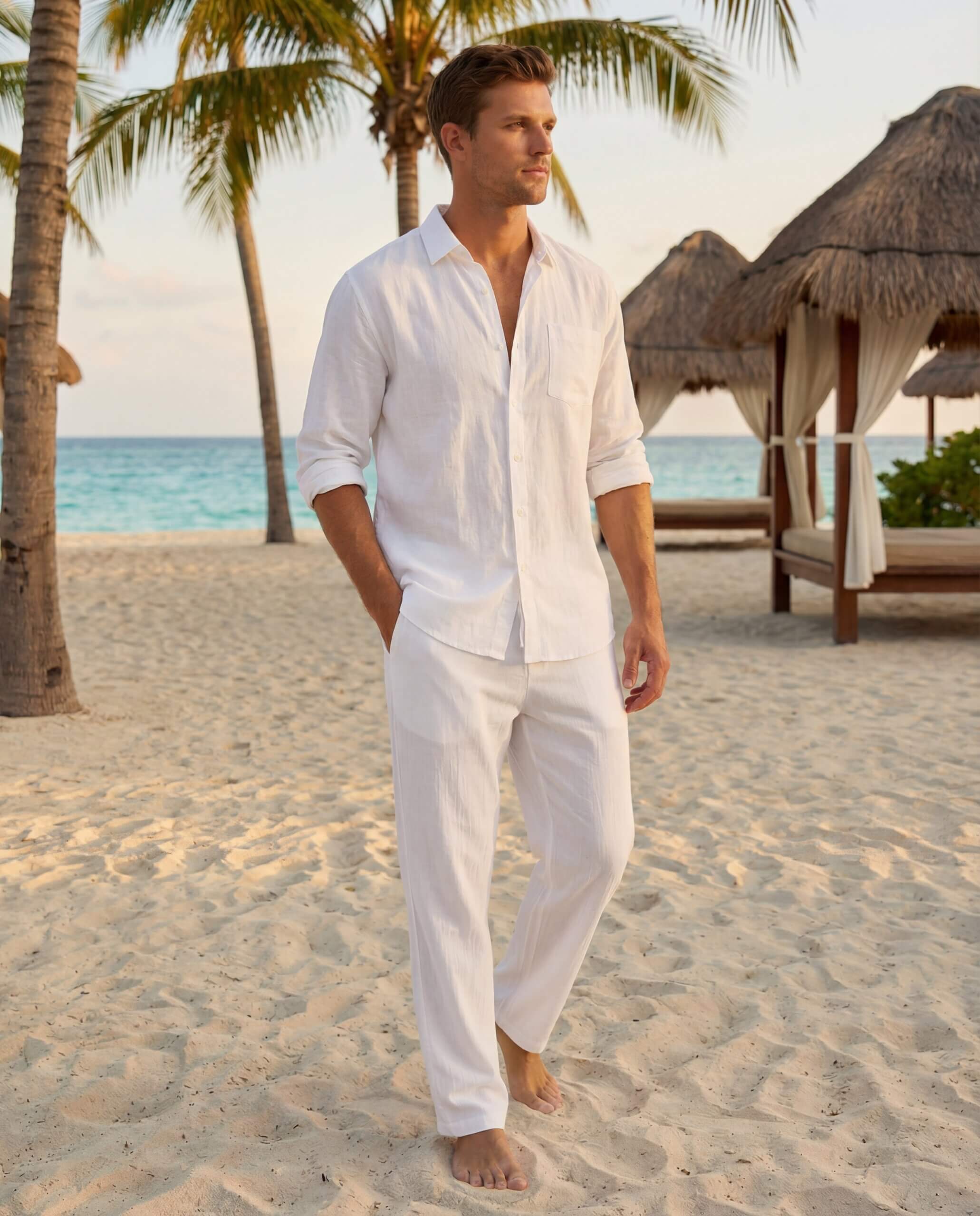 Cotton Natural cotton/linen blend long pants with elastic waistband and ties.