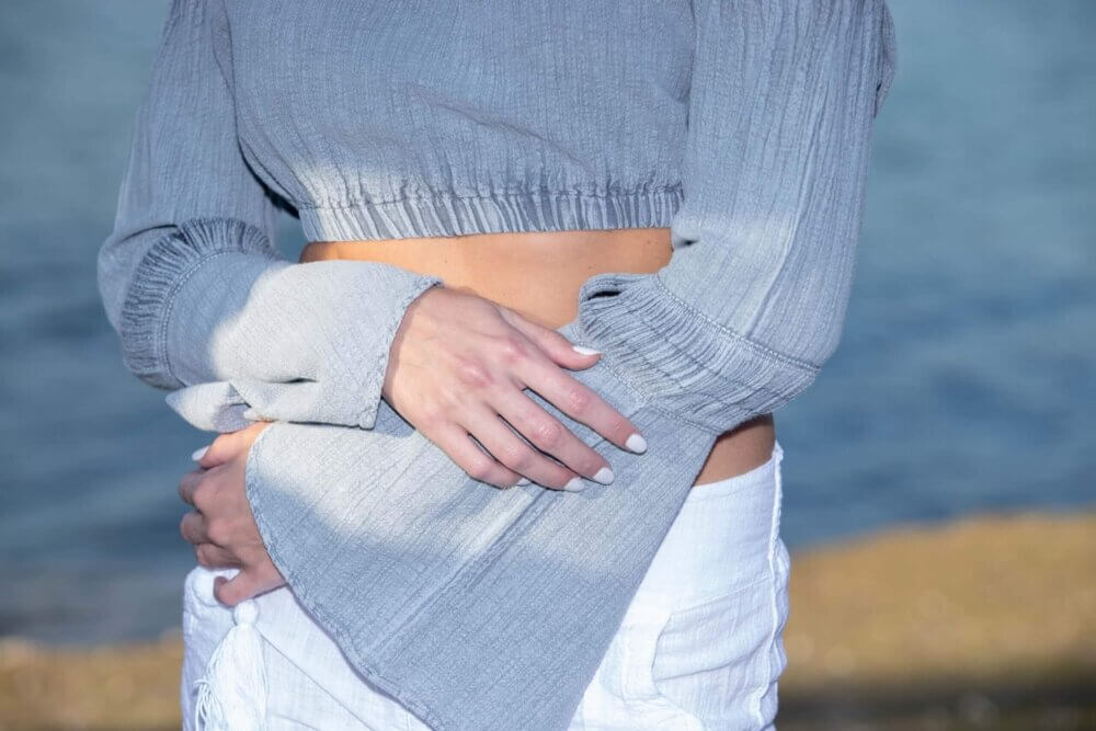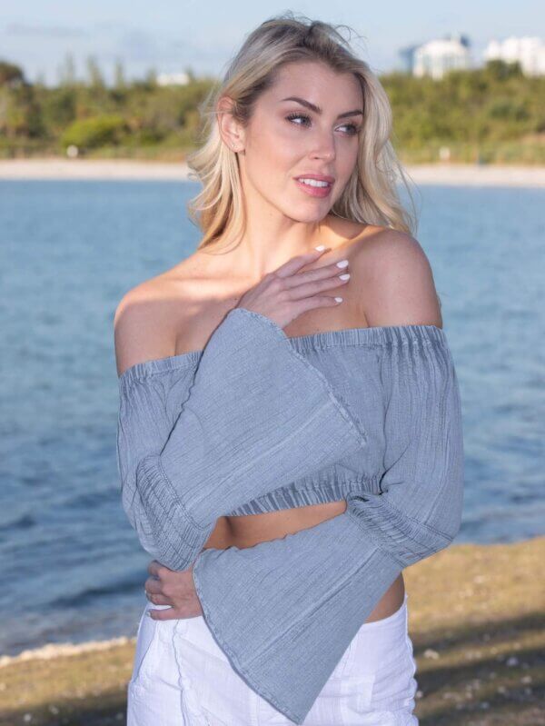 Cotton Natural women’s off the shoulder long sleeve top in Fossil Gray. This fun and flirty piece has an elastic band on top and bottom and has a beautiful slit design in the middle of the sleeves.