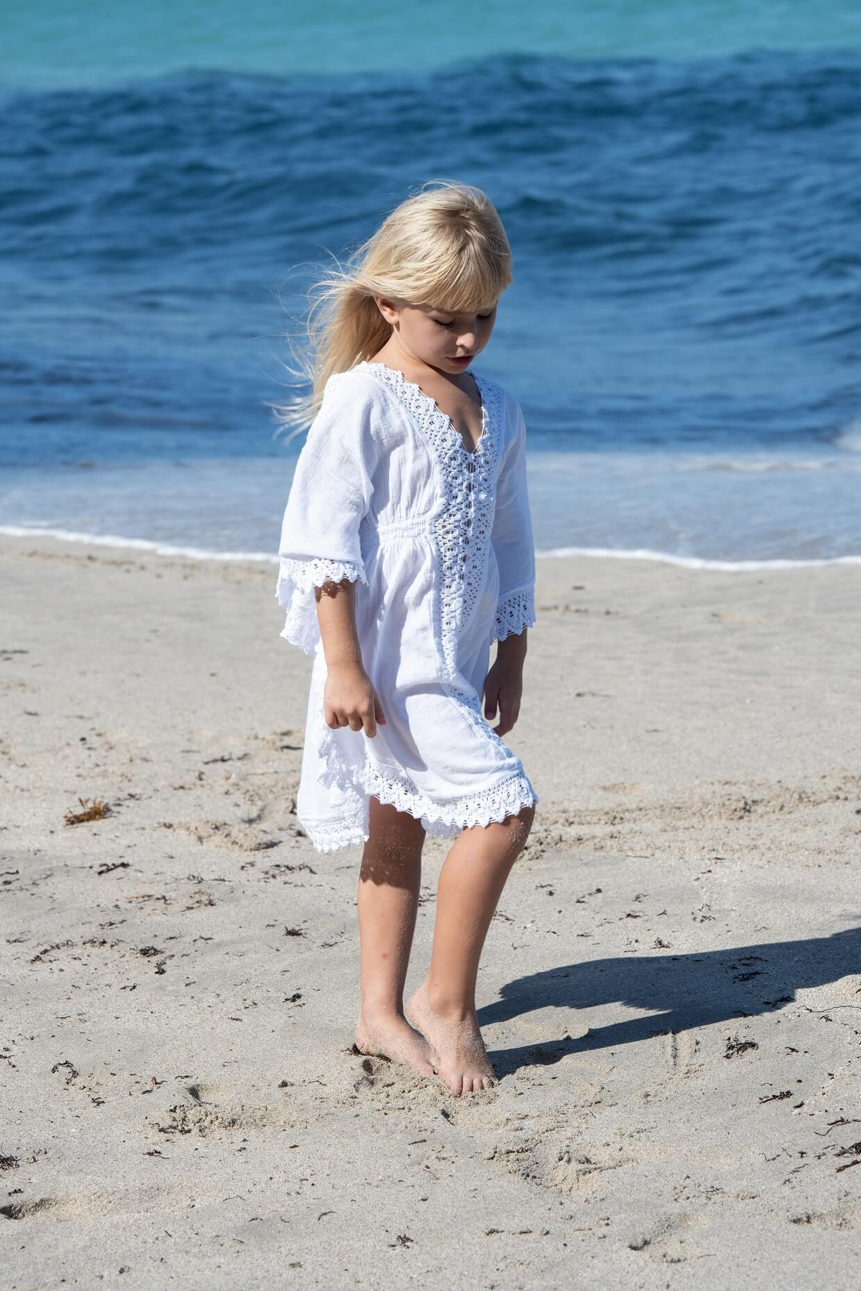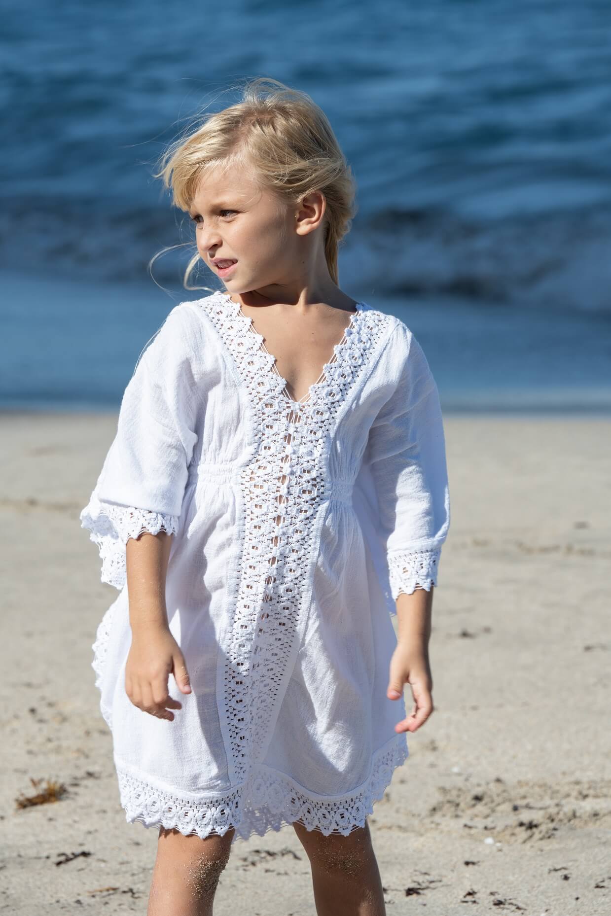 Girl’s Crochet V-Neck Cover Up. This impressive cover up has beautiful crochet detail work around the hem and neckline.