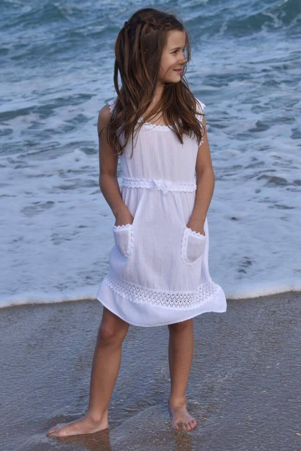 Cotton Natural Next Generation Girl’s Two Pocket Dress. This empire waist dress features crochet band and crochet bow around the waist. The two pockets have crochet around them along with a crochet hemline!