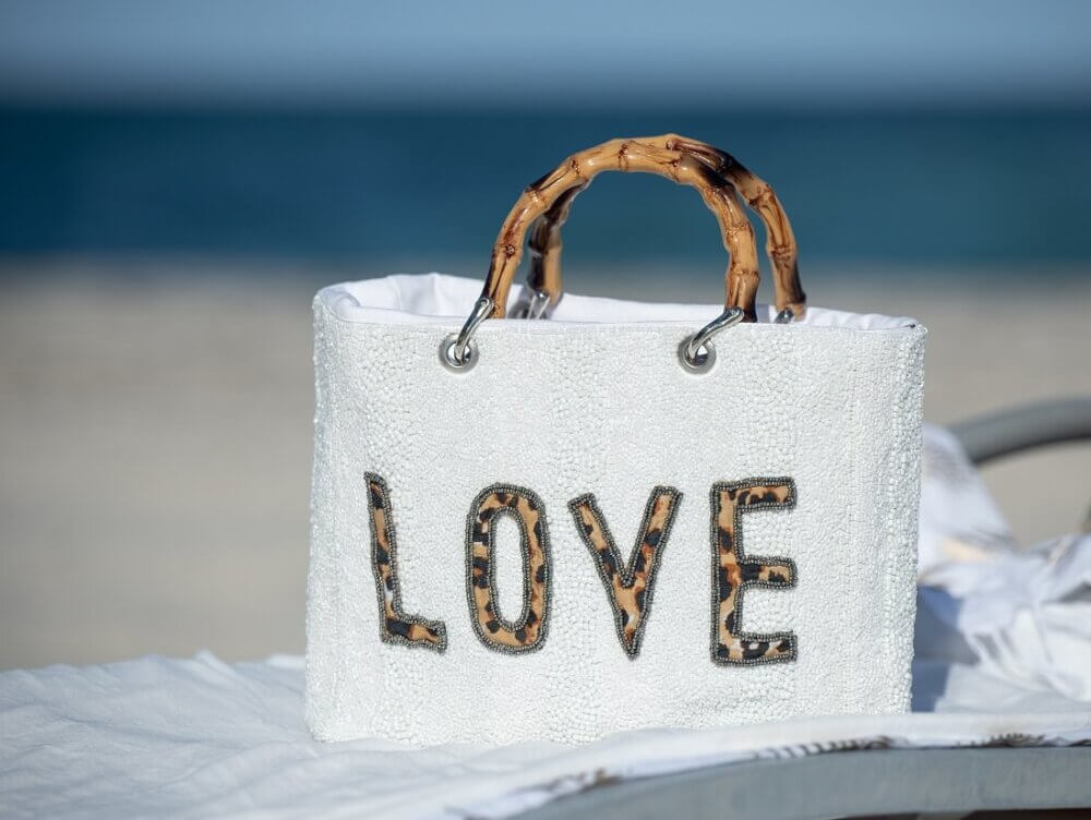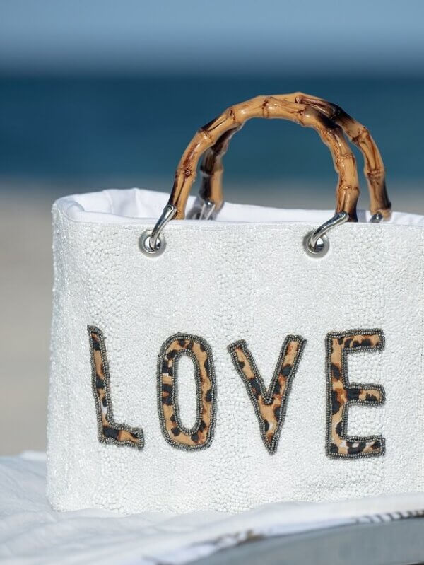 Medium-sized bag made of hand-sewn beads with natural resin handles.