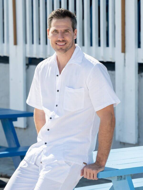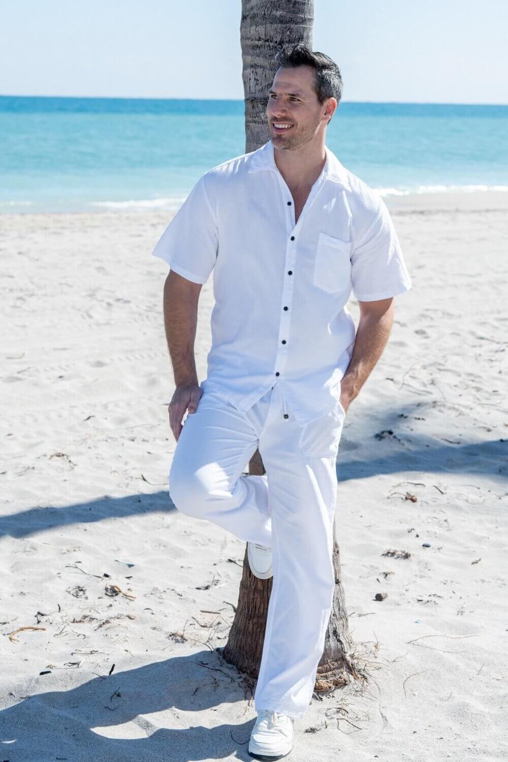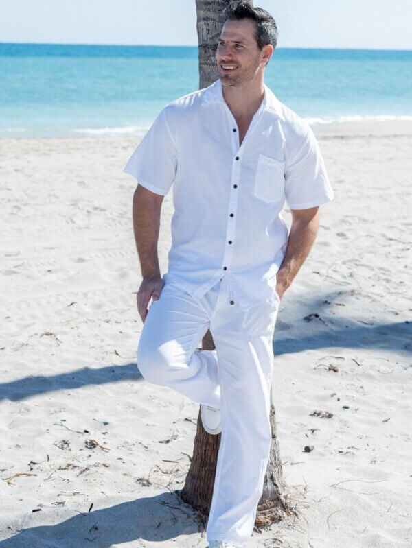 Cotton Natural cool and casual Men’s button down, short sleeves shirt with a pocket and a side hemline slits.