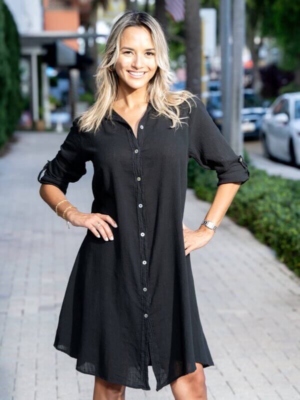 Cotton Natural Women’s long dress/top/cover-up in Black. This simple but elegant dress has full length buttons down the front center.