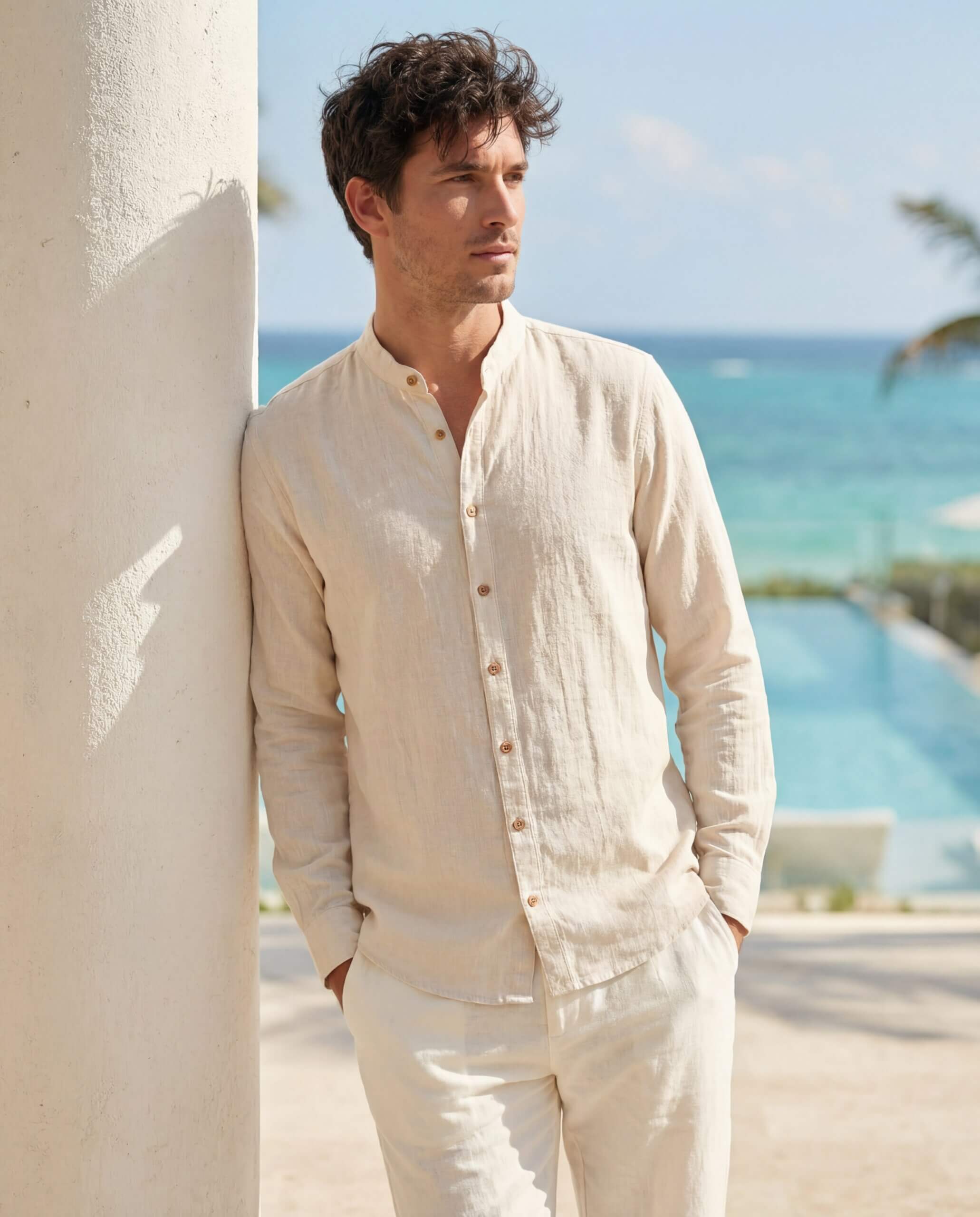 Cotton Natural Mandarin collar, long sleeve button down shirt in Beige.