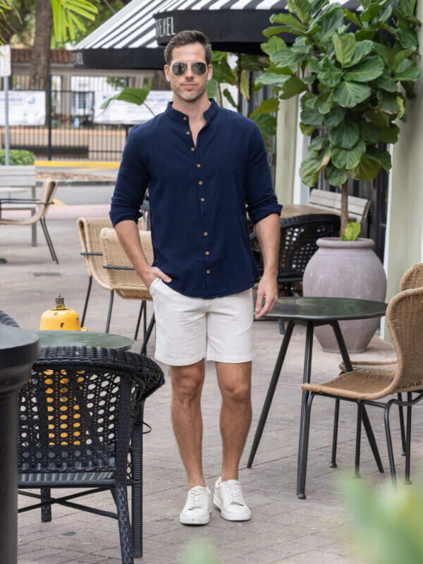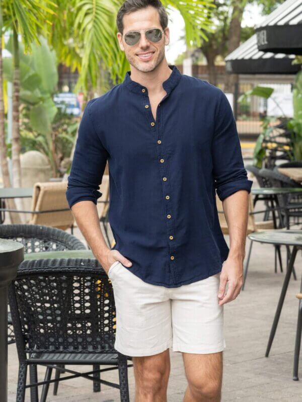 Cotton Natural Mandarin collar, long sleeve button down shirt in Dark Blue.