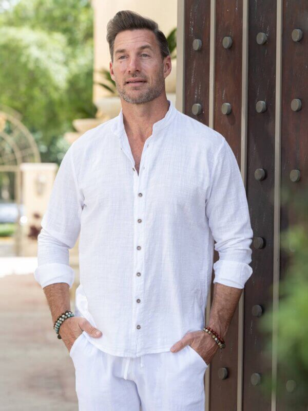 Cotton Natural Mandarin collar, long sleeve button down shirt.