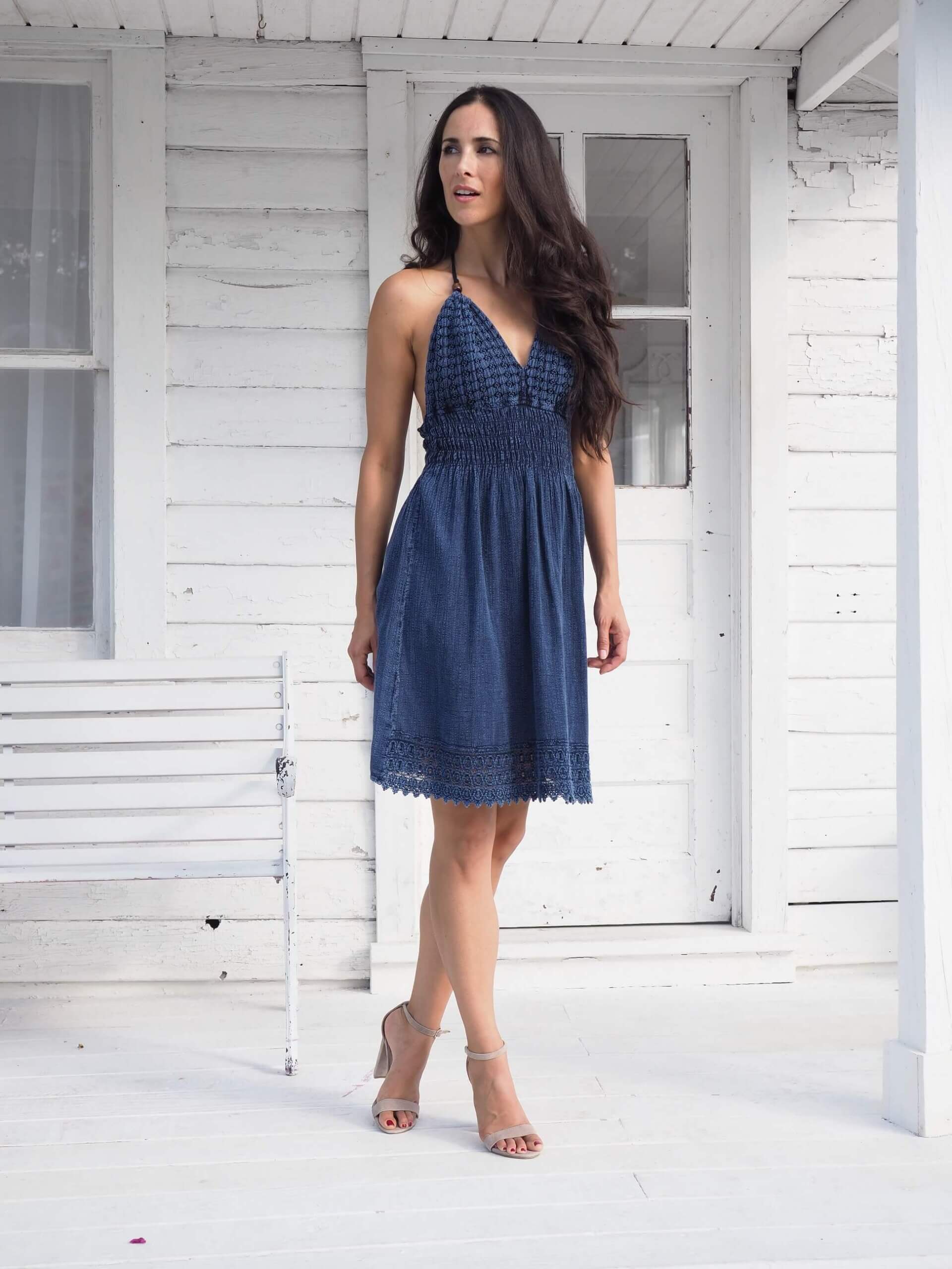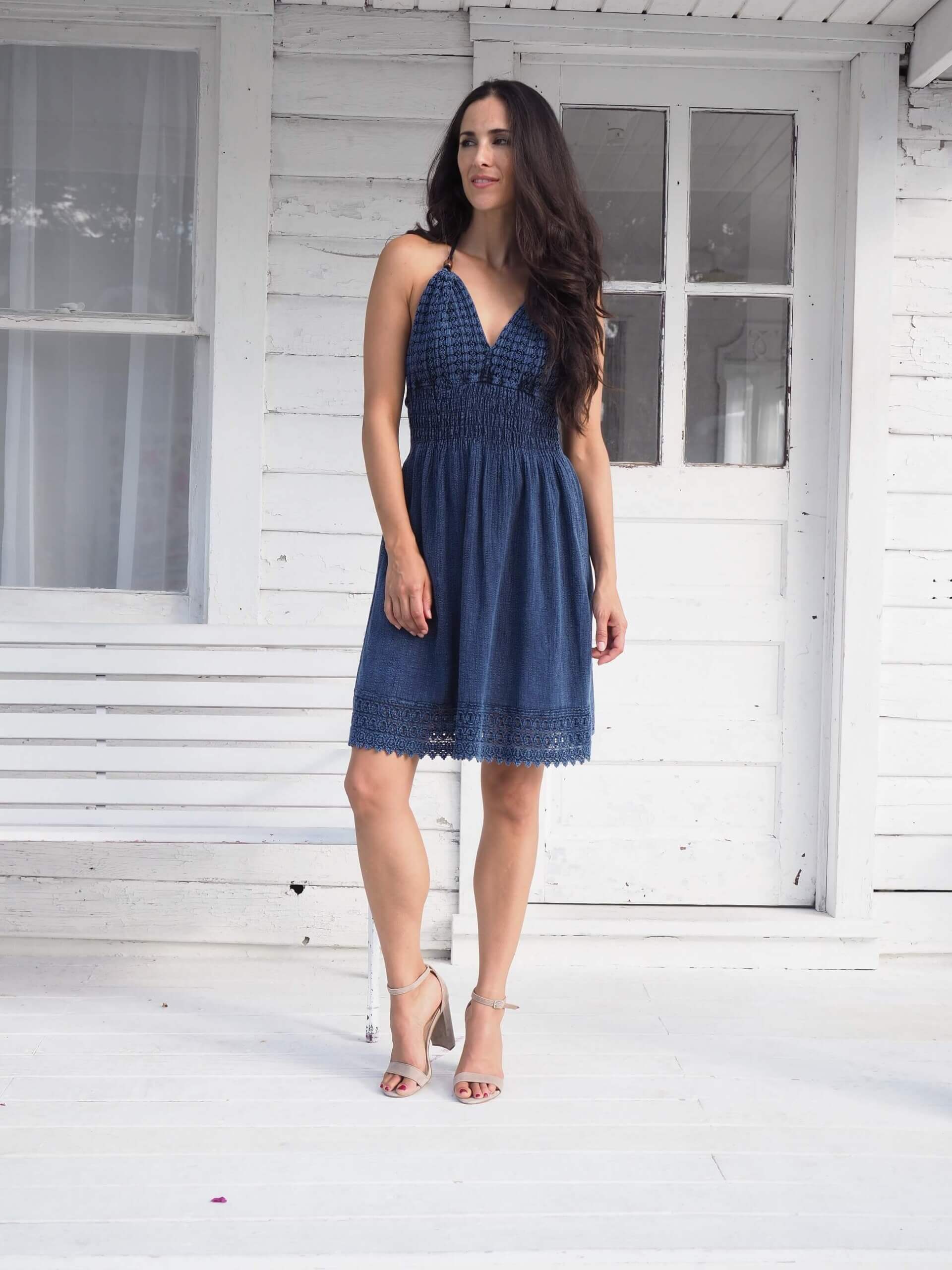 Cotton Natural women’s short spaghetti strap dress, wood beads on straps, beautiful detailed embroidery and openwork at the bottom, adjustable straps in Midnight Blue.