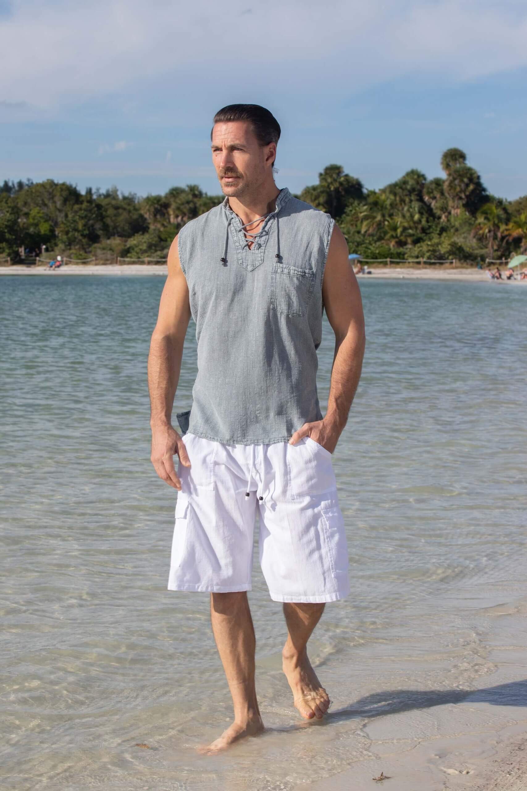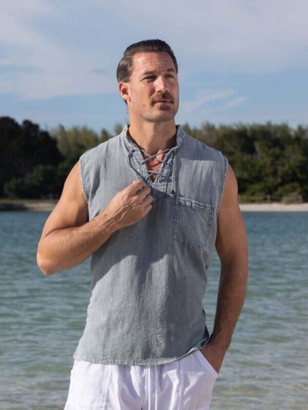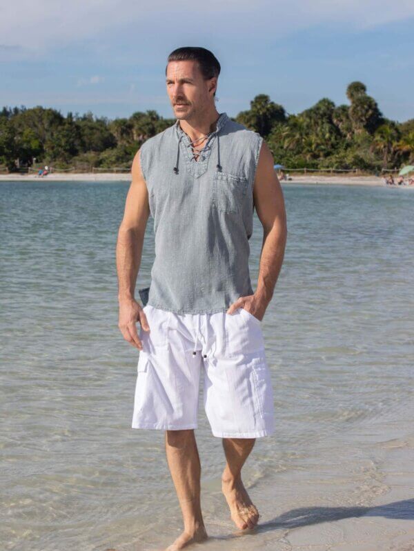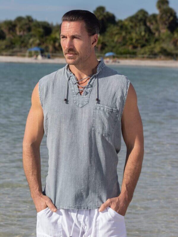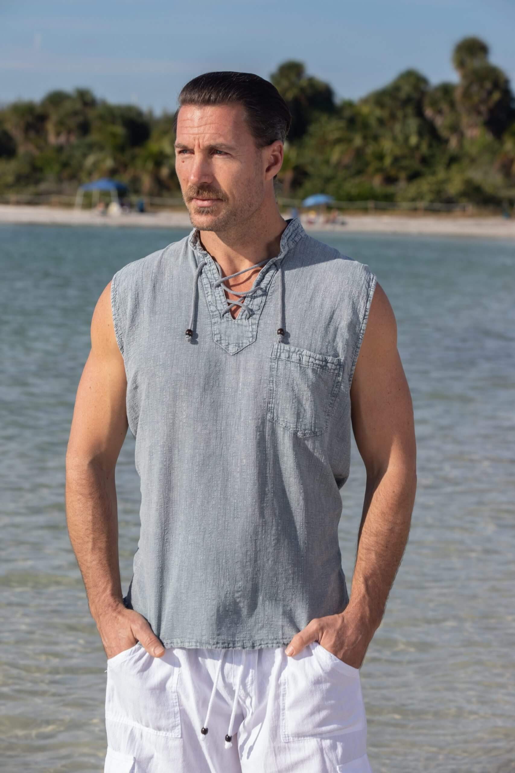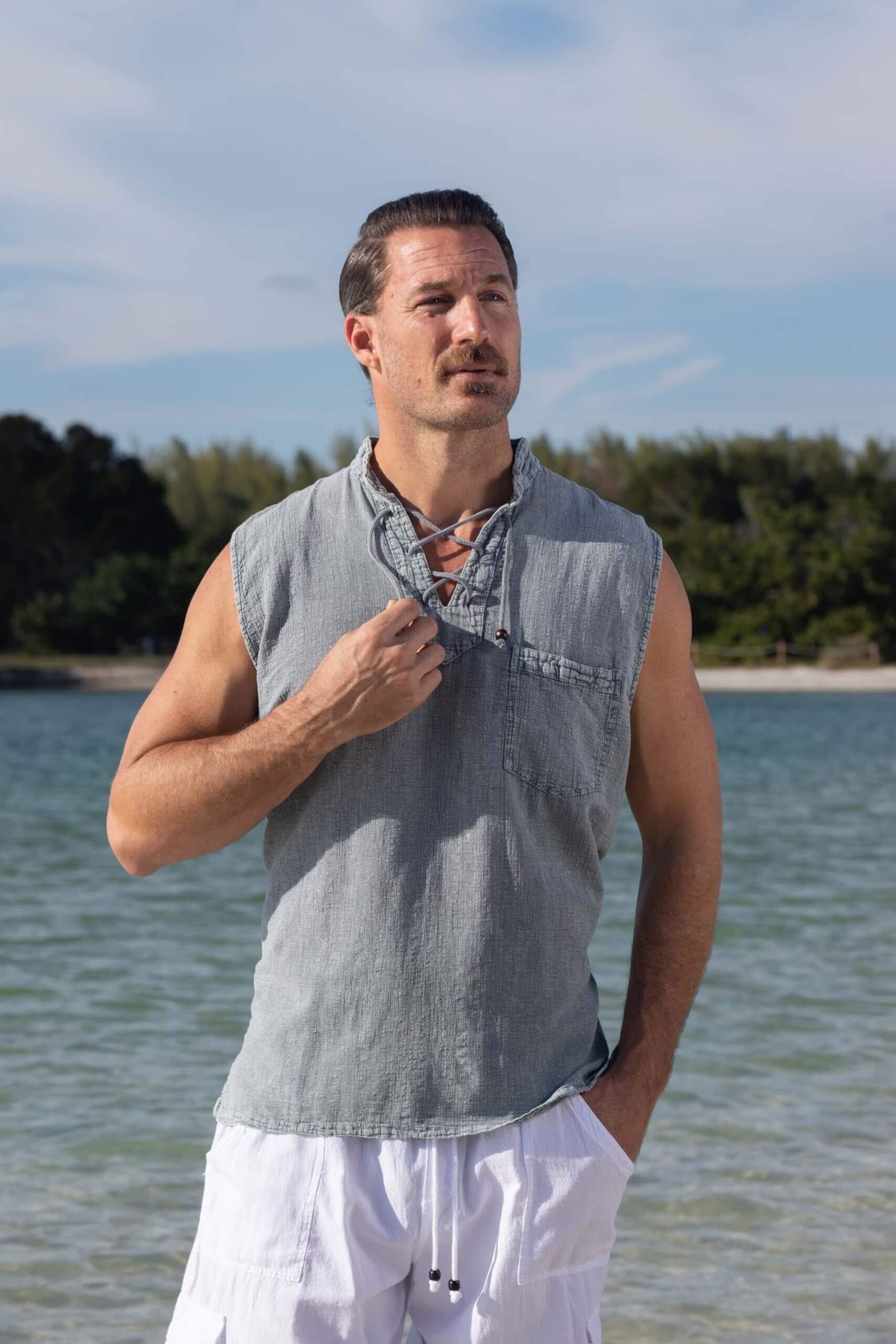 Cotton Natural cool and casual Men’s sleeveless-shirt in Fossil Gray with drawstring beads.