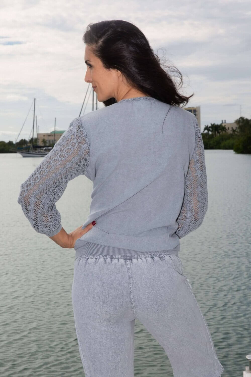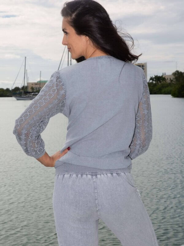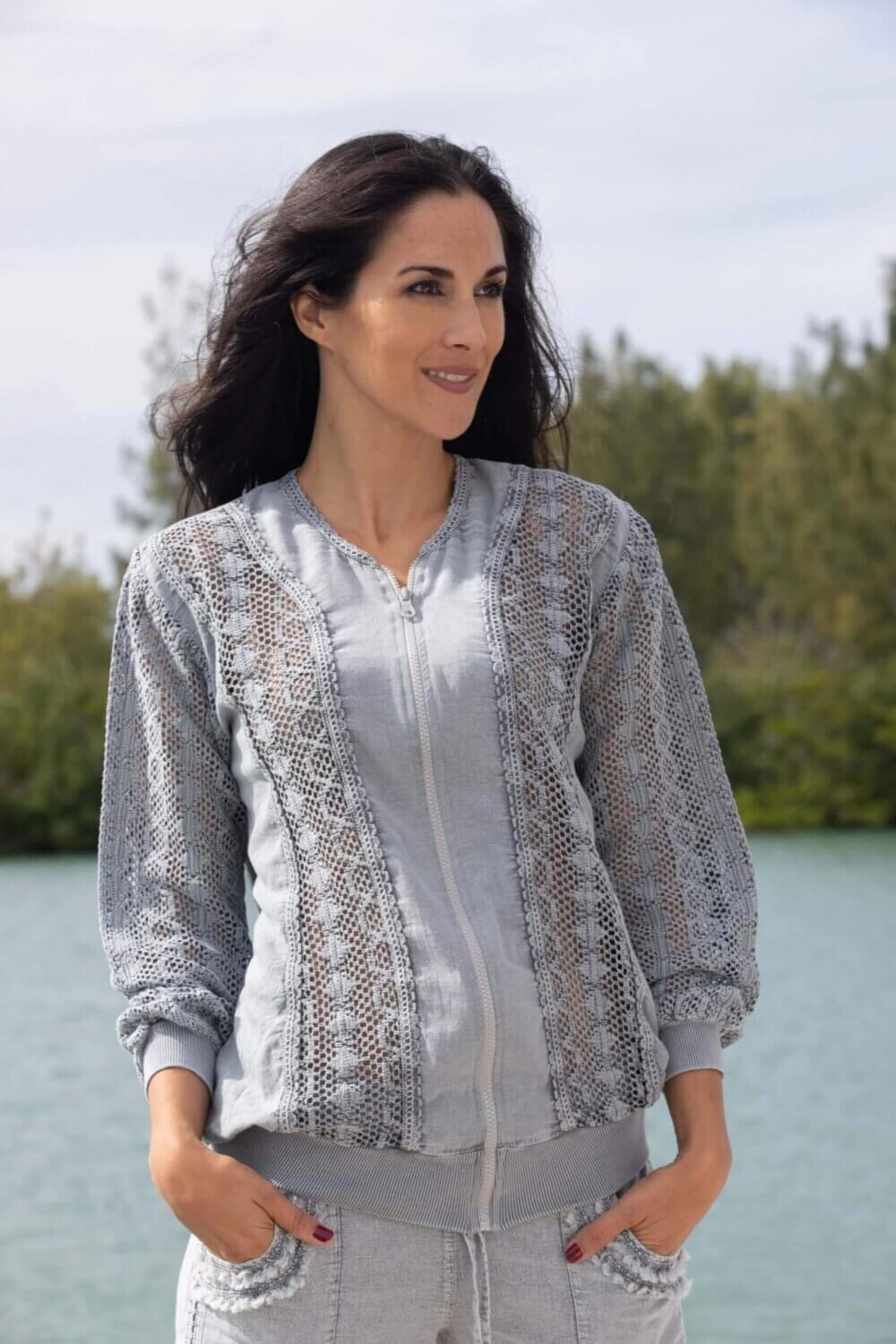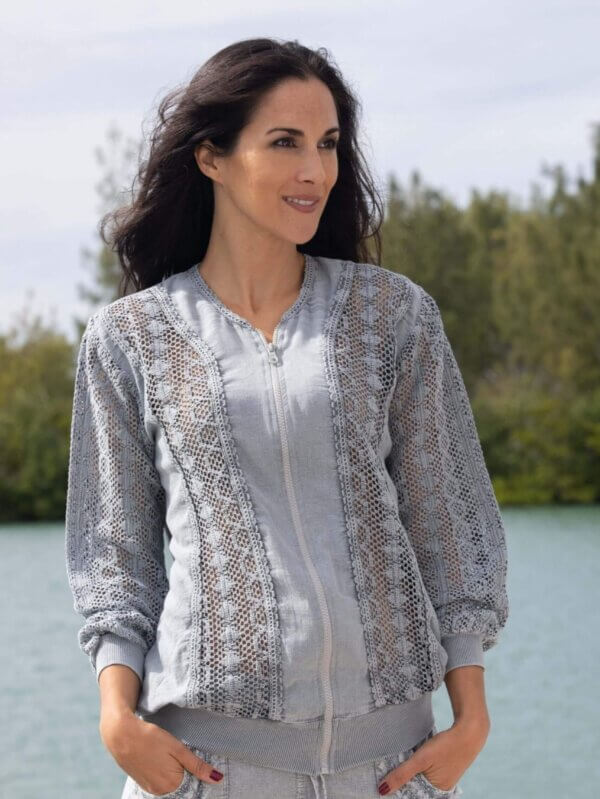 Cotton Natural beautiful long sleeve zipper jacket with elaborate mesh style pattern in Fossil Gray.