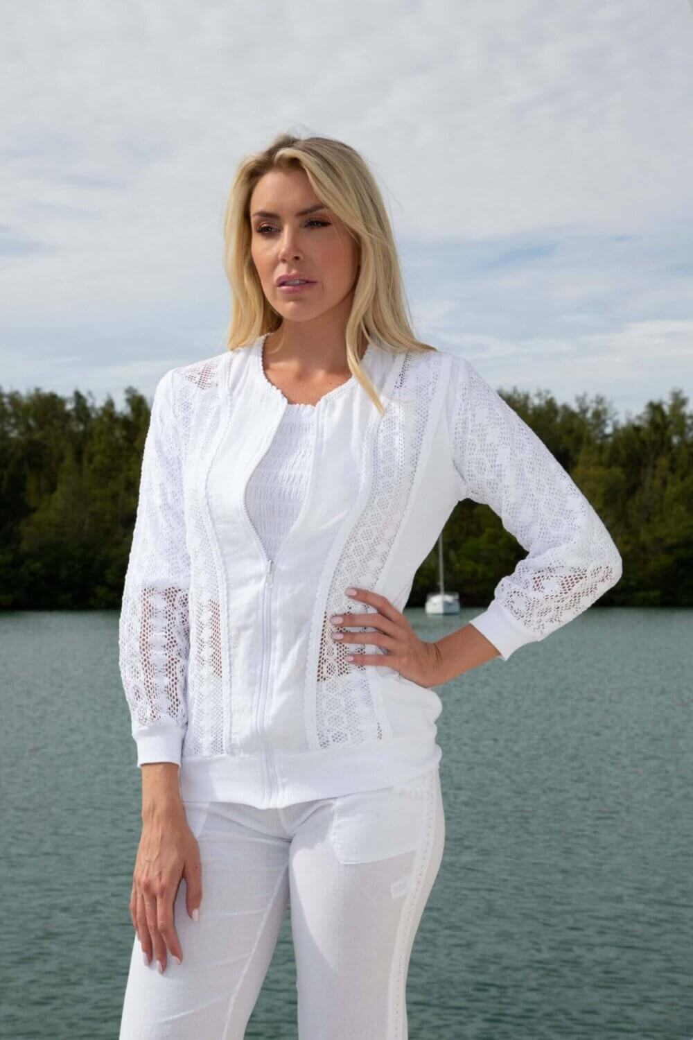 Cotton Natural beautiful long sleeve zipper jacket with elaborate mesh style pattern.