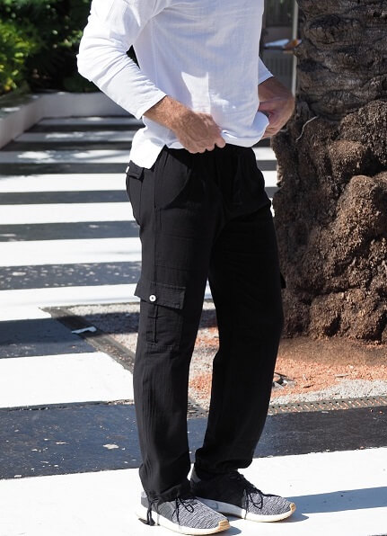 Cotton Natural long cargo pants featuring drawstrings in Black.