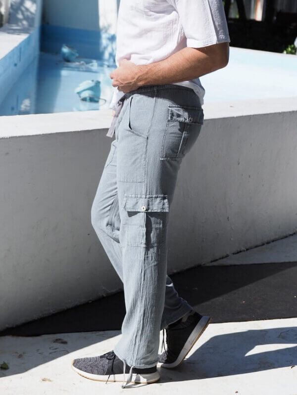 Cotton Natural long cargo pants featuring drawstrings in Fossil Gray.