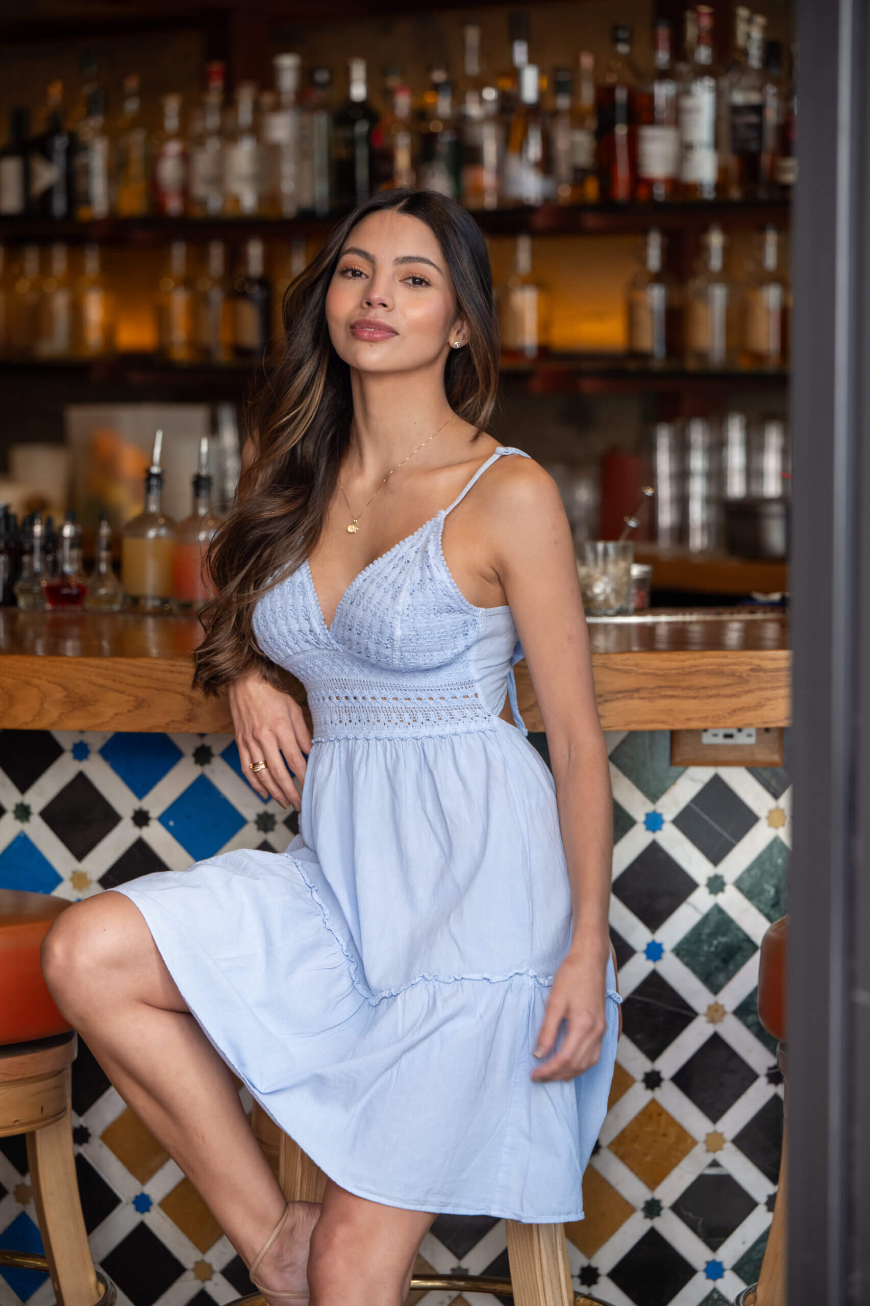 Cotton Natural V-Neck dress, knee length with beautiful detailed crochet, and adjustable spaghetti straps with tie in back in Sky Blue.