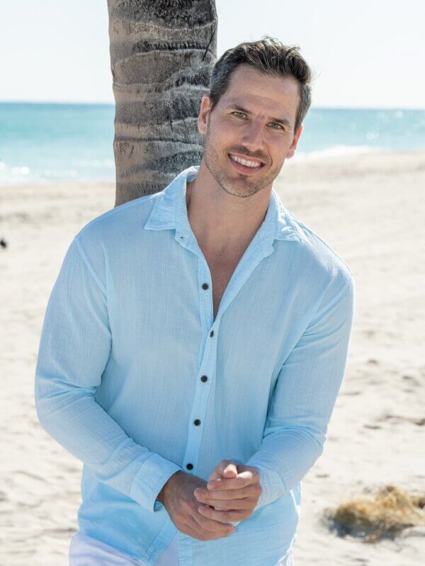 Cotton Natural roll up long-sleeve, with wood buttons in Arctic Blue.