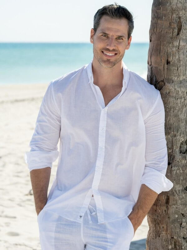 Cotton Natural Men’s roll up sleeve, with white buttons.